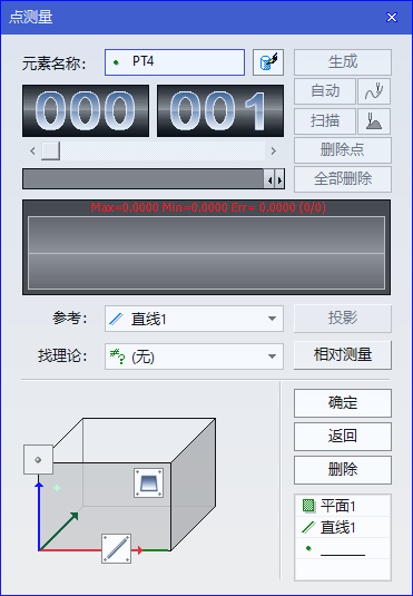 ☆确定:所需测量元素全部测量前该按钮不可操作,在可操作的情况下点击该按钮将自动回到坐标系窗口界面。