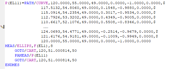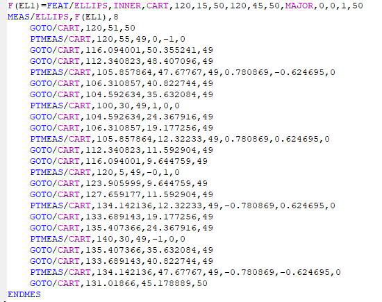 ▶生成DMIS,“120,15,50,120,45,50”为根据定义窗口参数生成的椭圆两个焦点的坐标,生成语句如下:F(EL1)=FEAT/ELLIPS,INNER,CART,120,15,50,120,45,50,MAJOR,0,0,1,50